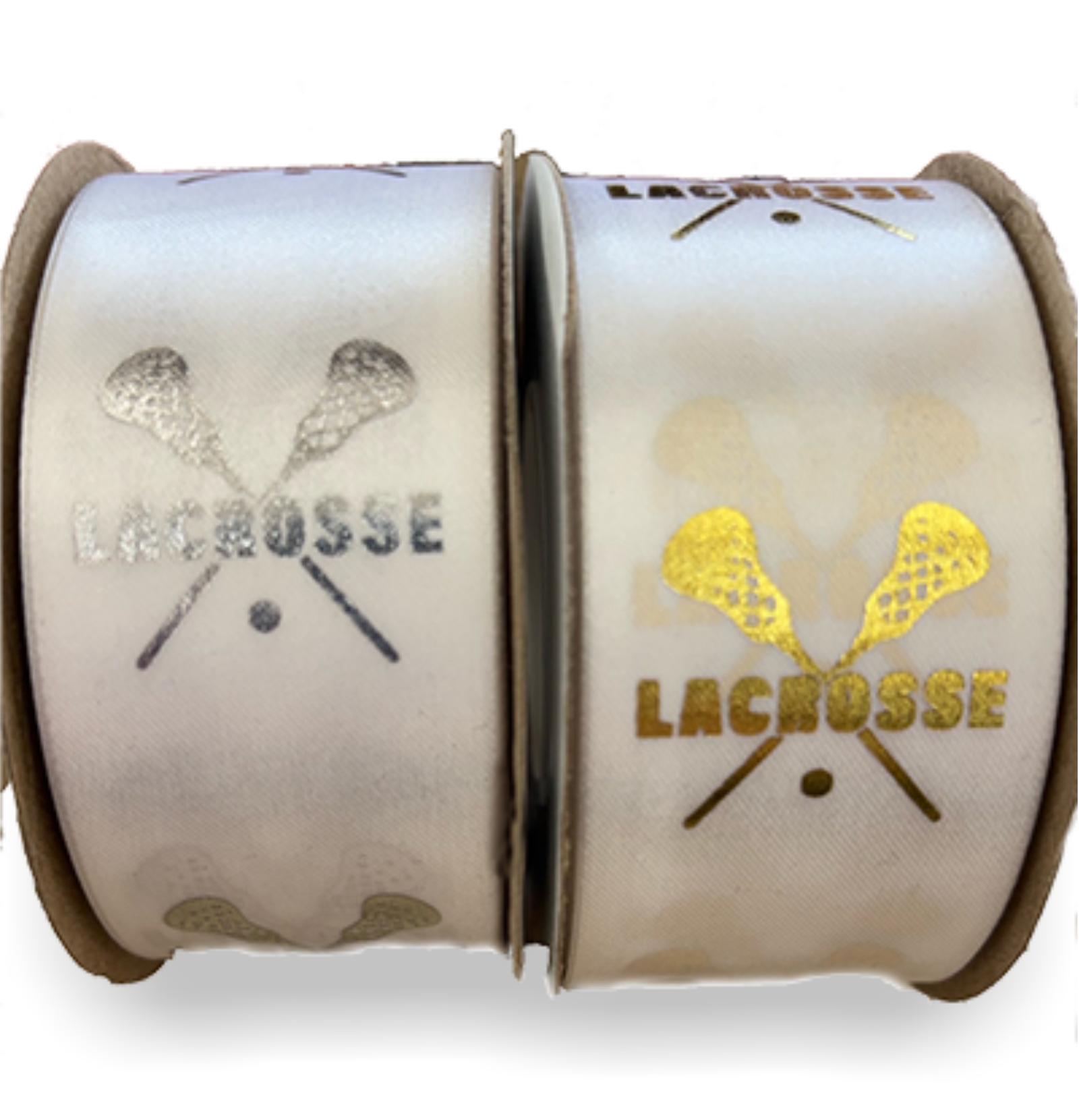 Ribbon – Lacrosse 1-5/16″ #9 Foil Print – White w/ Silver – 25yds